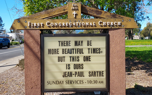 FCC Sonoma is excited to offer many ways to be together in Christian love. Our Sunday gatherings are held at 9:30 a.m. for Meditation in the Redwood Grove (excluding the 1st Sunday of the month) and at 10:30 a.m. in the Sanctuary for our regular service. Chair Yoga is every 1st Sunday, 9:30 a.m. to 10:15 a.m in the West Wing. Details for the current Sunday's services can be found by clicking the "This Week" tab located at the top of this page. Our Earth Care Team offers monthly learning opportunities and spiritual walks, our Social Action Team organizes outreach activities. We enjoy being together to pursue new ideas and grow spiritually, to seek justice and serve those in need, and to advocate for the care of the earth. We invite you to join our community of love, acceptance, and service. Click here to learn about our Mission and Values. Click here to contact us directly.