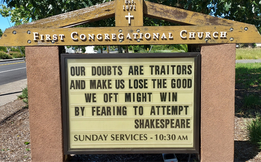 Rev. Reichert often says, “FCC is the place you would want to go to church if you went to church.” We are a gathering of spirited people who care about earth justice, speaking out about injustice, tending to the vulnerable, and learning to find common ground. These are the relevant earmarks of our congregation. We invite you to join us on Sunday mornings, either contemplative at 9:00 am or regular service at 10:30 am.